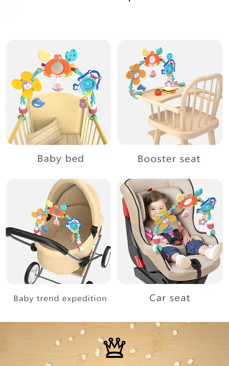 This mobile is designed to fit onto car seats, highchairs, baby beds, strollers, and more. It's flexible and adaptable to any environment, making it perfect for on-the-go parents.