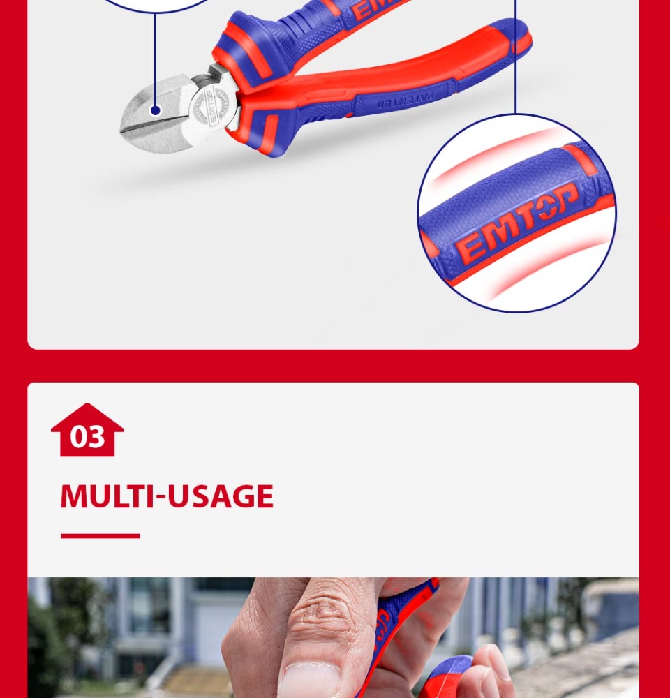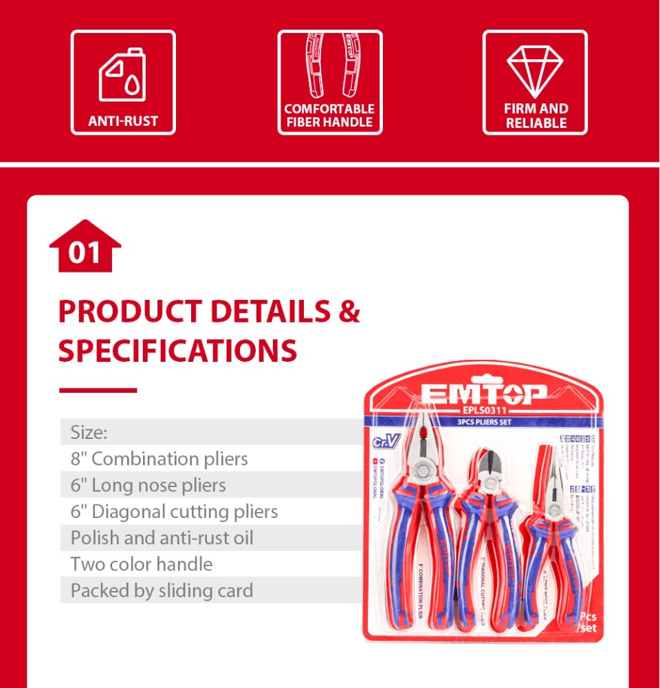 Bộ kìm EMTOP 3PCS, kìm kết hợp 8 inch, kìm mũi dài 6 inch, kìm cắt chéo 6 inch, kìm dây đa chức năng EPLS0311